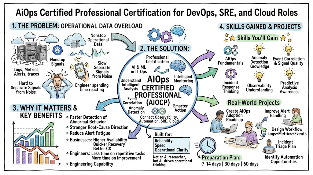 The AiOps Certified Professional (AIOCP) certification offers a practical path for engineers and managers who want to understand the future of IT operations. It helps professionals move beyond basic monitoring and begin thinking in terms of smarter signals, better visibility, stronger incident handling, and more useful automation. That makes it relevant for DevOps engineers, SREs, cloud professionals, software teams, platform engineers, and technical leaders. The strongest value of AIOCP is not only the credential itself. It is the improvement in how you think about production systems and operational data. When you learn to use intelligence instead of only manual effort, you become better prepared for modern engineering environments. With hands-on practice and the right next learning step, AIOCP can become a strong foundation for long-term career growth.
