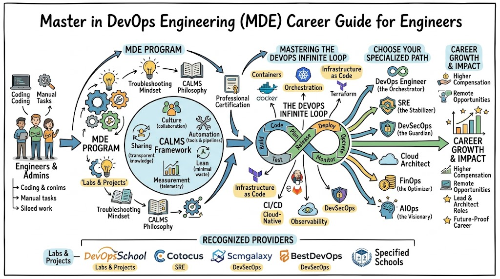 Earning your Master in DevOps Engineering (MDE) is a career-defining move. In an industry that aggressively rewards those who can bridge the gap between “code” and “scale,” this certification is your architectural blueprint for the future. By choosing a reputable partner like DevOpsSchool and committing to hands-on mastery, you aren’t just obtaining a certificate—you are future-proofing your career in the global cloud economy. Now is the time to transition from an administrator to a high-value Platform Architect.